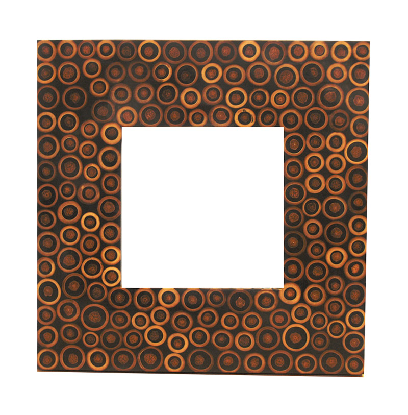 Wood frame with cross-cut bamboo rings and dried sunflower buds in resin. Includes mirror glass.