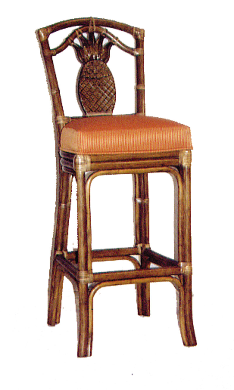 Rattan frame with hand carved wood pineapple decor at chair back.