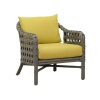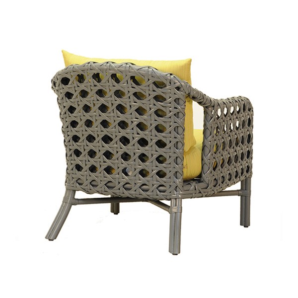 Rattan frame with woven, sliced rattan. Includes seat and back cushion.